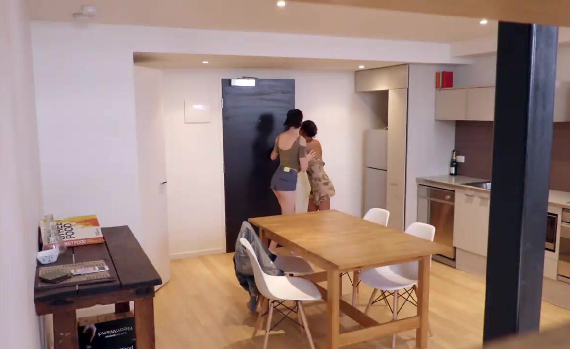 Luci Q and Rubi Valetine lesbian brunette close ups face sitting fingering hairy pussy kitchen lingerie masturbation seduction